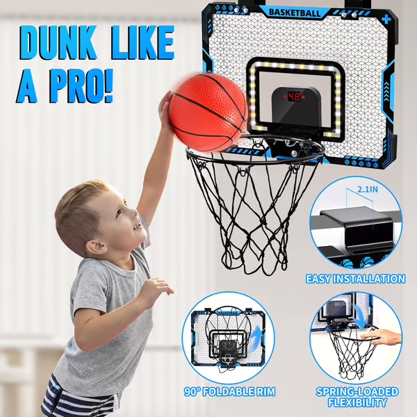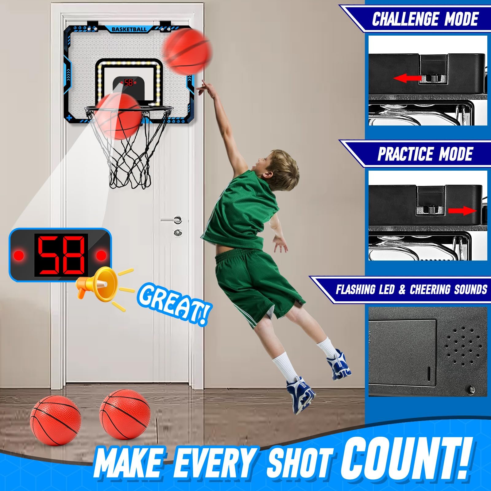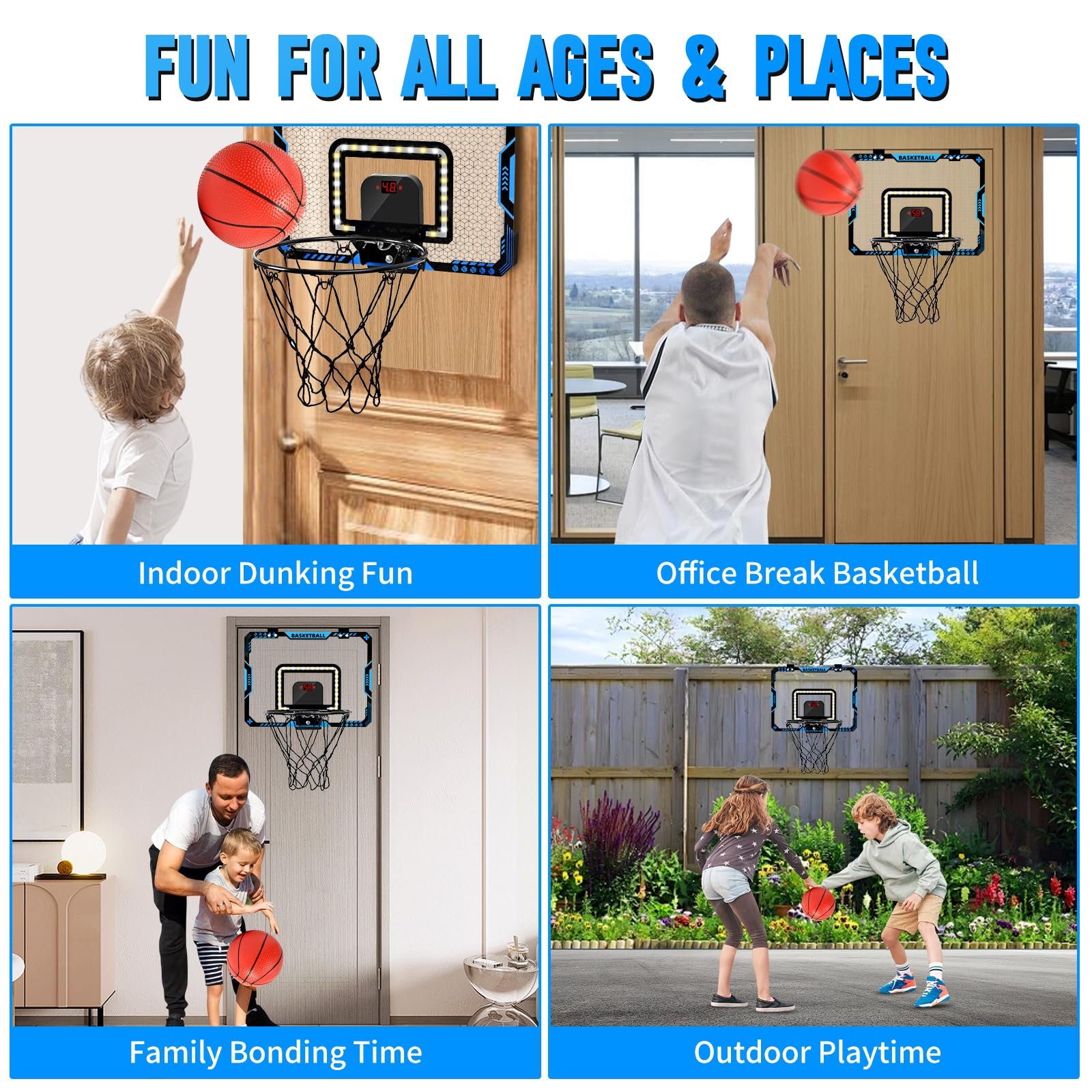 Interactive LED Lighting & Safe Electronic Scoreboard: The indoor mini basketball hoop with vibrant LED lights and a child-safe electronic scoreboard makes every shot exciting with lights and cheers, creating a more engaging game experience. Enhance your indoor basketball hoop games, making them more fun and interactive for kids and the whole family with this mini basketball hoop.